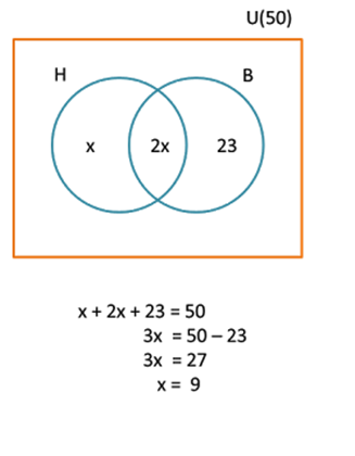 Se hizo una evaluación de control de calidad a un lote de 50 equipos de cómputo en malas condiciones de fabricación. Los criterios analizados fueron: H: defecto en el disco duro. B: defecto en la placa base (board) Se observó que los equipos con mal funcionamiento en ambos dispositivos, disco duro y board, son el doble de los que sólo tienen disco duro dañado; mientras que los que sólo tienen desperfecto en board son 23 equipos. Encontrar el número de equipos con desperfecto en disco duro y el número de equipos con daño en ambos dispositivos.